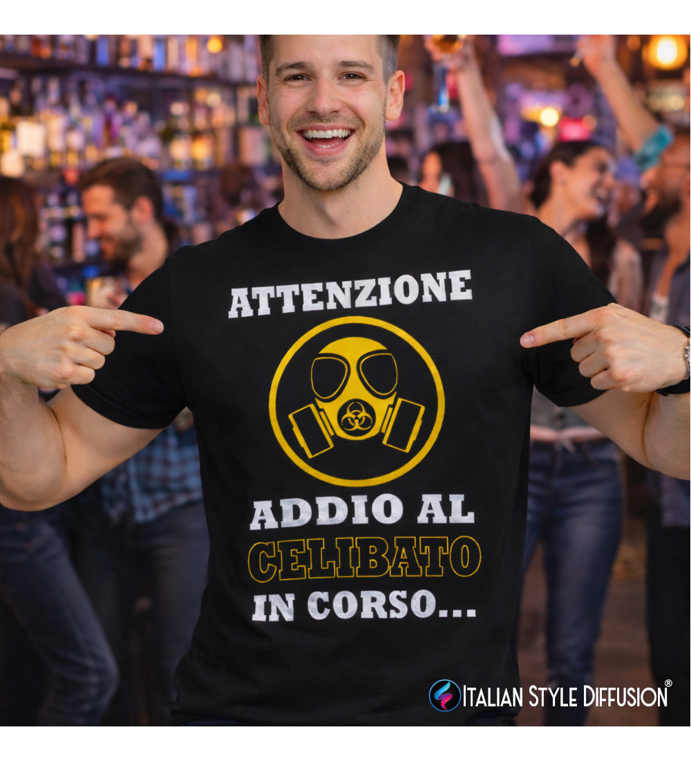 Messaggio chiaro: ATTENZIONE – ADDIO AL CELIBATO IN CORSO… 😄 Questa t-shirt è perfetta per creare subito atmosfera durante la serata e far capire a tutti che il party è iniziato. Grafica d’impatto con stile “warning” e simbolo maschera, ideale per team sposo, amici e testimoni.