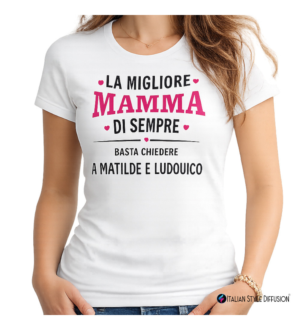 Se sta cercando un regalo che faccia sorridere (e commuovere) al primo sguardo, questa T-shirt è la scelta giusta. La grafica con la frase “La migliore mamma di sempre” è pensata per essere chiara, elegante e super leggibile, con la possibilità di inserire i nomi dei figli (nell’esempio: Matilde e Ludovico).
