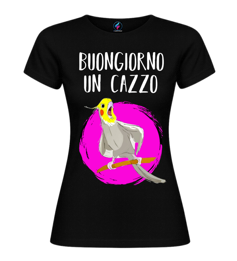 T-shirt divertente da donna con scritta ironica “Buongiorno un cazzo” e grafica pappagallo. In puro cotone con stampa nitida e resistente, perfetta per chi ama l’umorismo irriverente e le magliette originali.