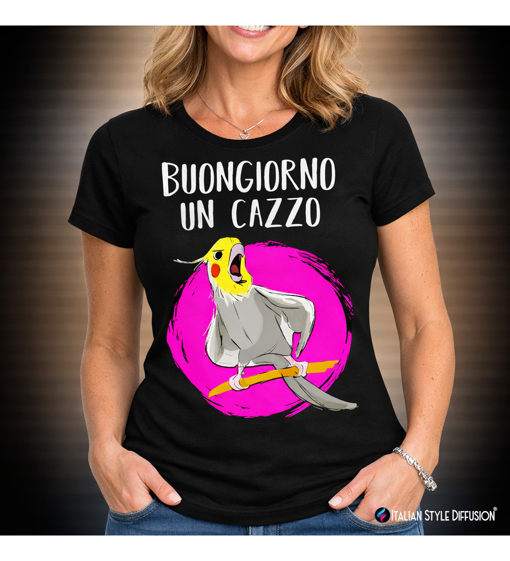 Maglietta divertente pappagallo “Buongiorno un cazzo” da donna