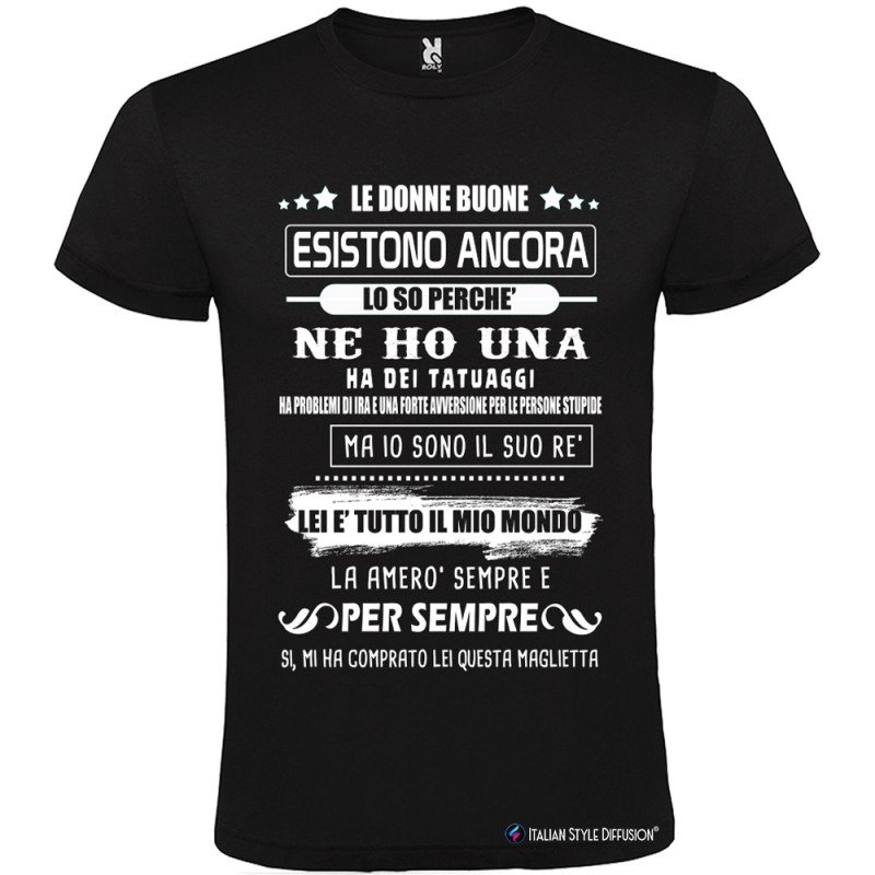 Una t-shirt ironica e romantica perfetta per chi vuole dedicare una frase simpatica alla propria lei: “Le donne buone esistono ancora, lo so perché ne ho una”. Un mix di dolcezza e sarcasmo, con la possibilità di inserire il mese di nascita nella grafica.
