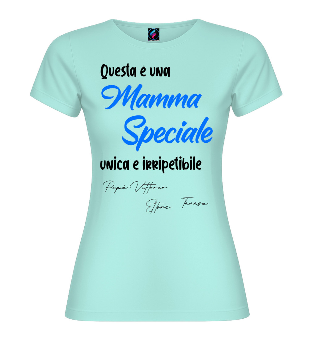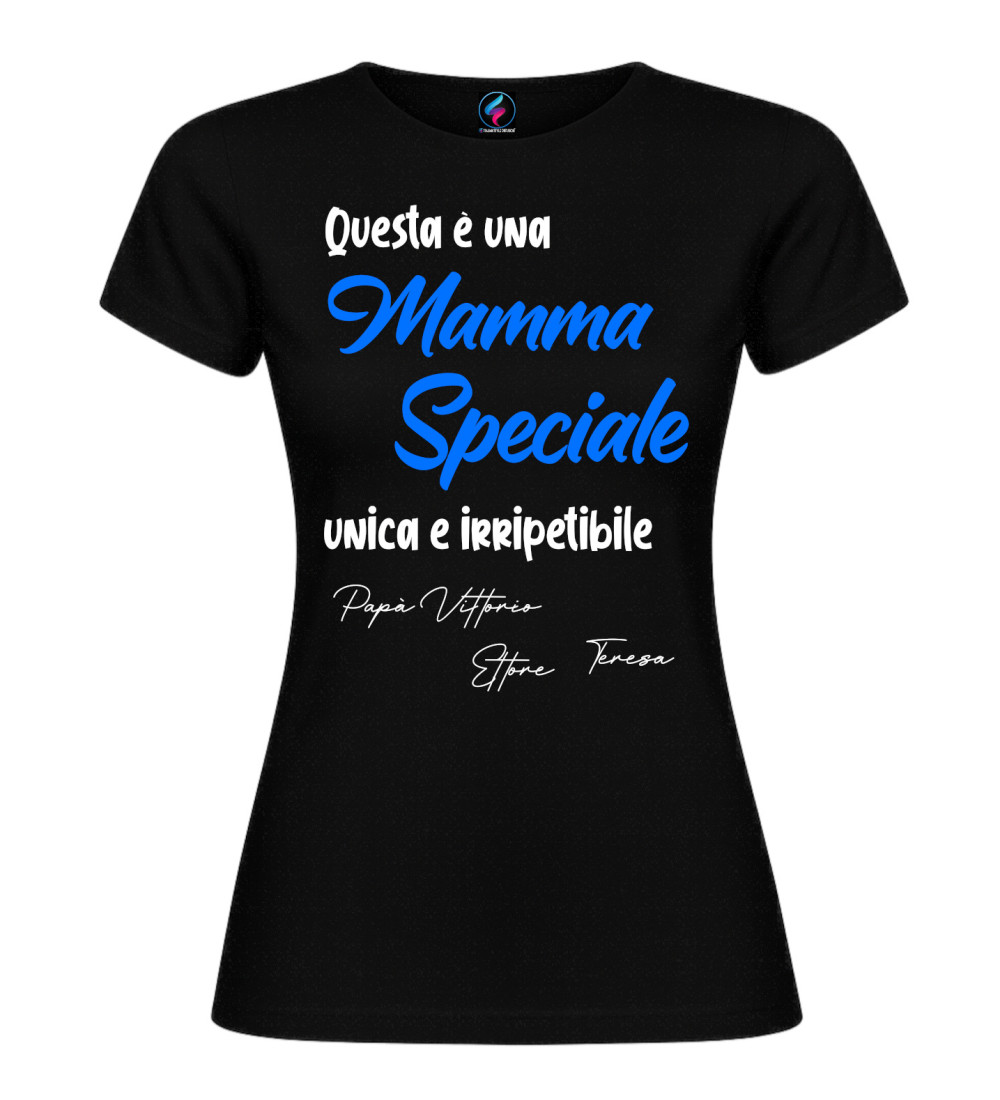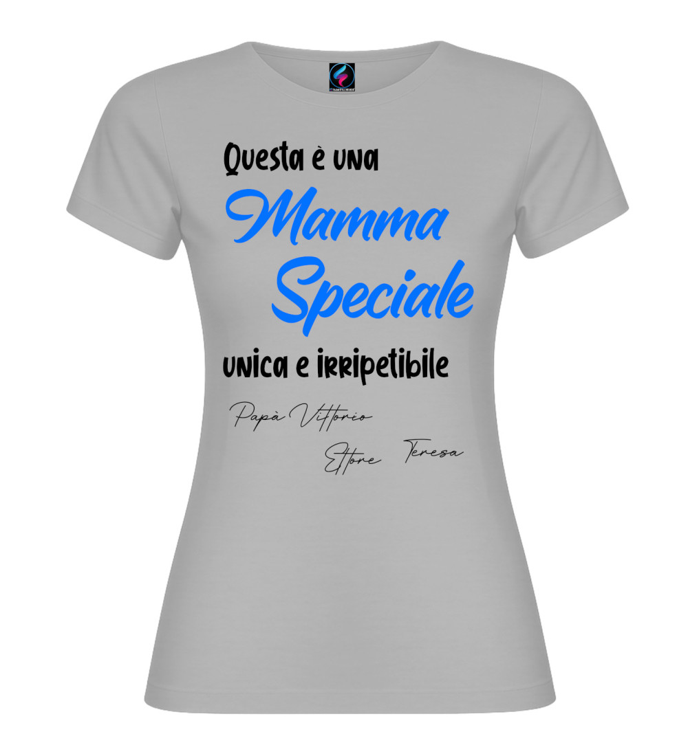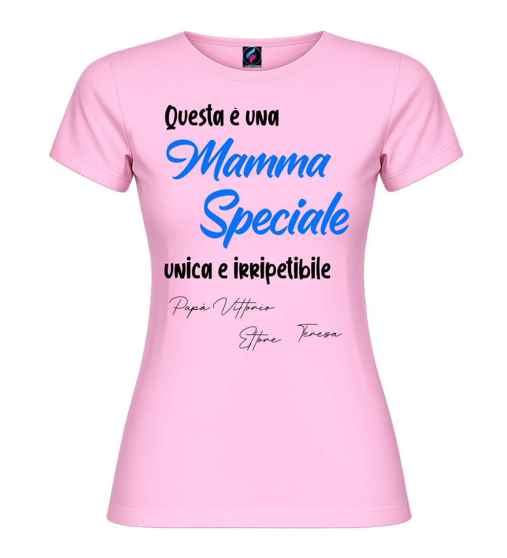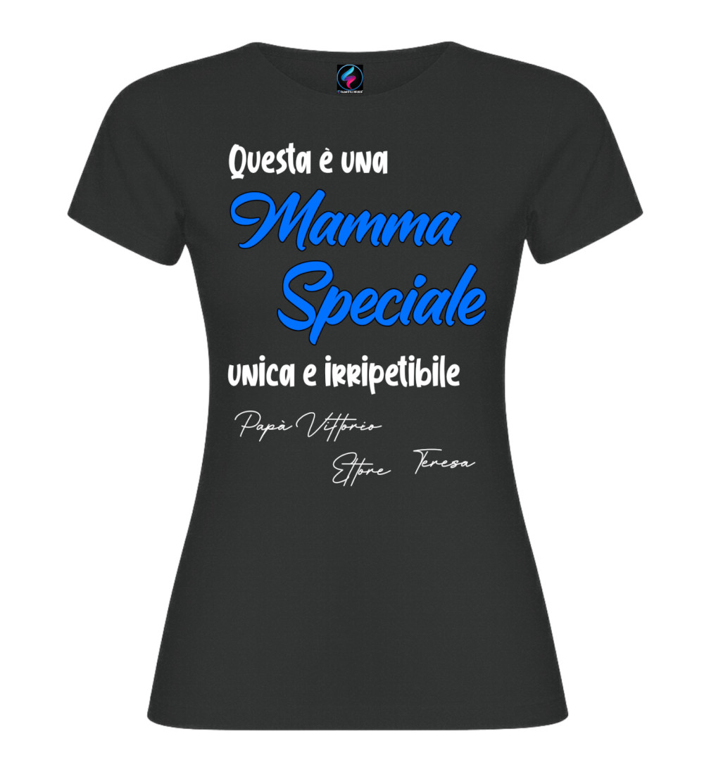T-shirt donna con scritta “Questa è una Mamma Speciale, unica e irripetibile” e possibilità di personalizzare con i nomi (es. Papà, figli o familiari). Idea regalo perfetta per Festa della Mamma e compleanno.