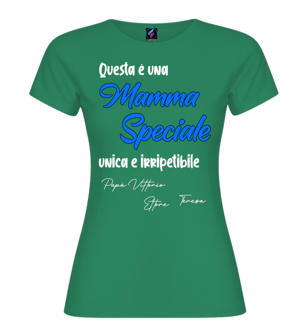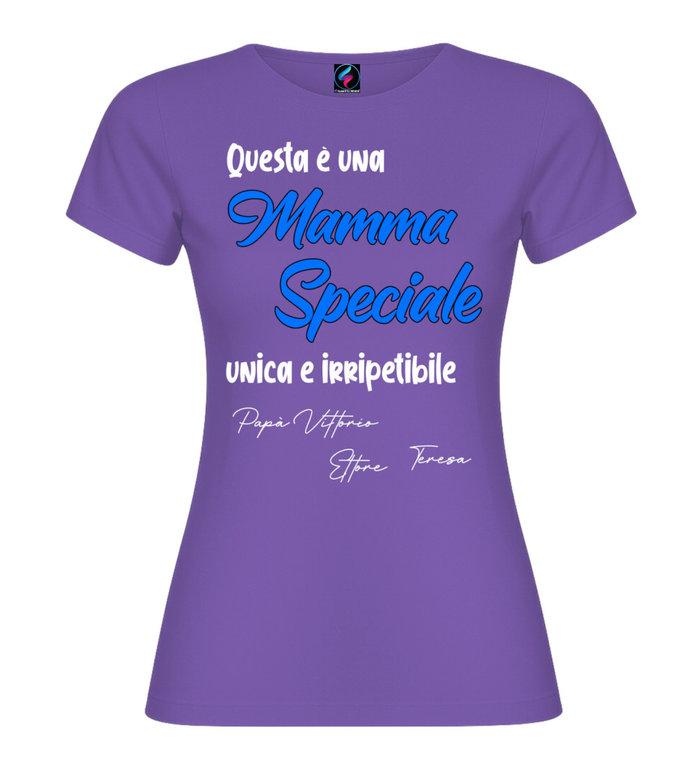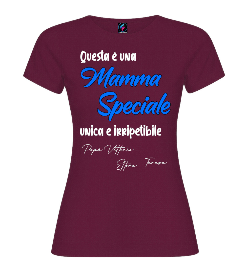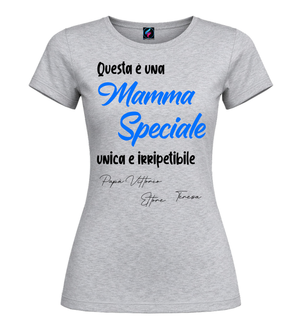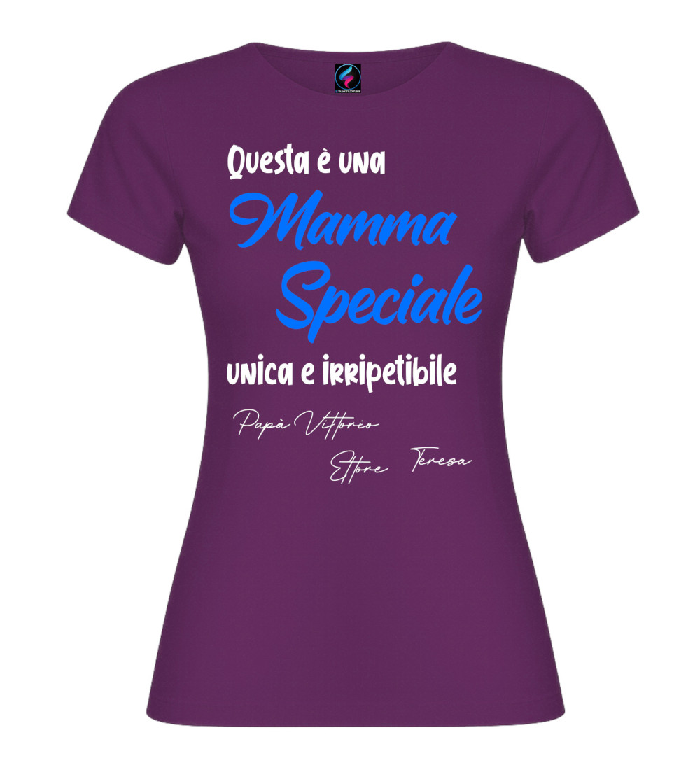 T-shirt donna con scritta “Questa è una Mamma Speciale, unica e irripetibile” e possibilità di personalizzare con i nomi (es. Papà, figli o familiari). Idea regalo perfetta per Festa della Mamma e compleanno.
