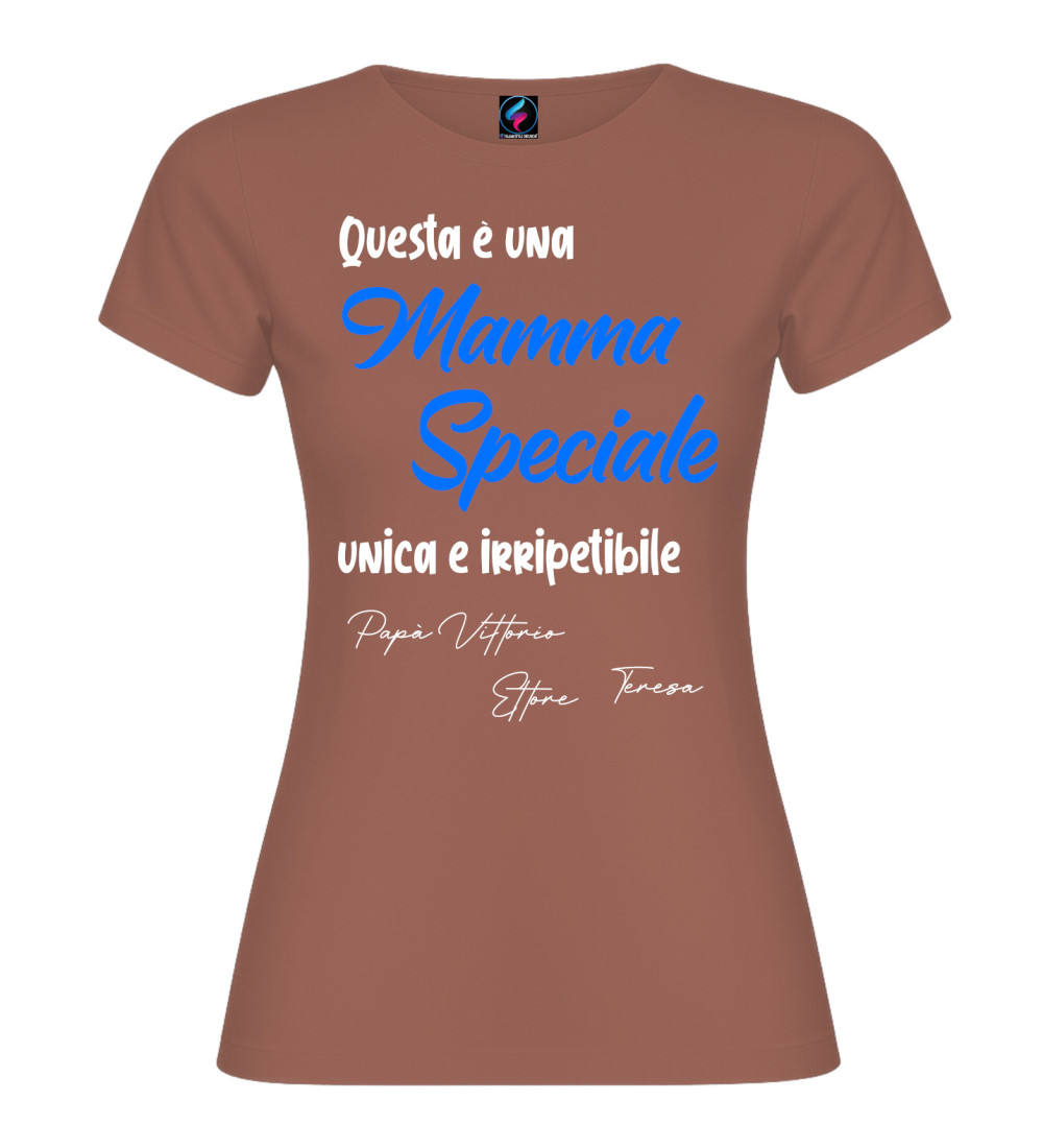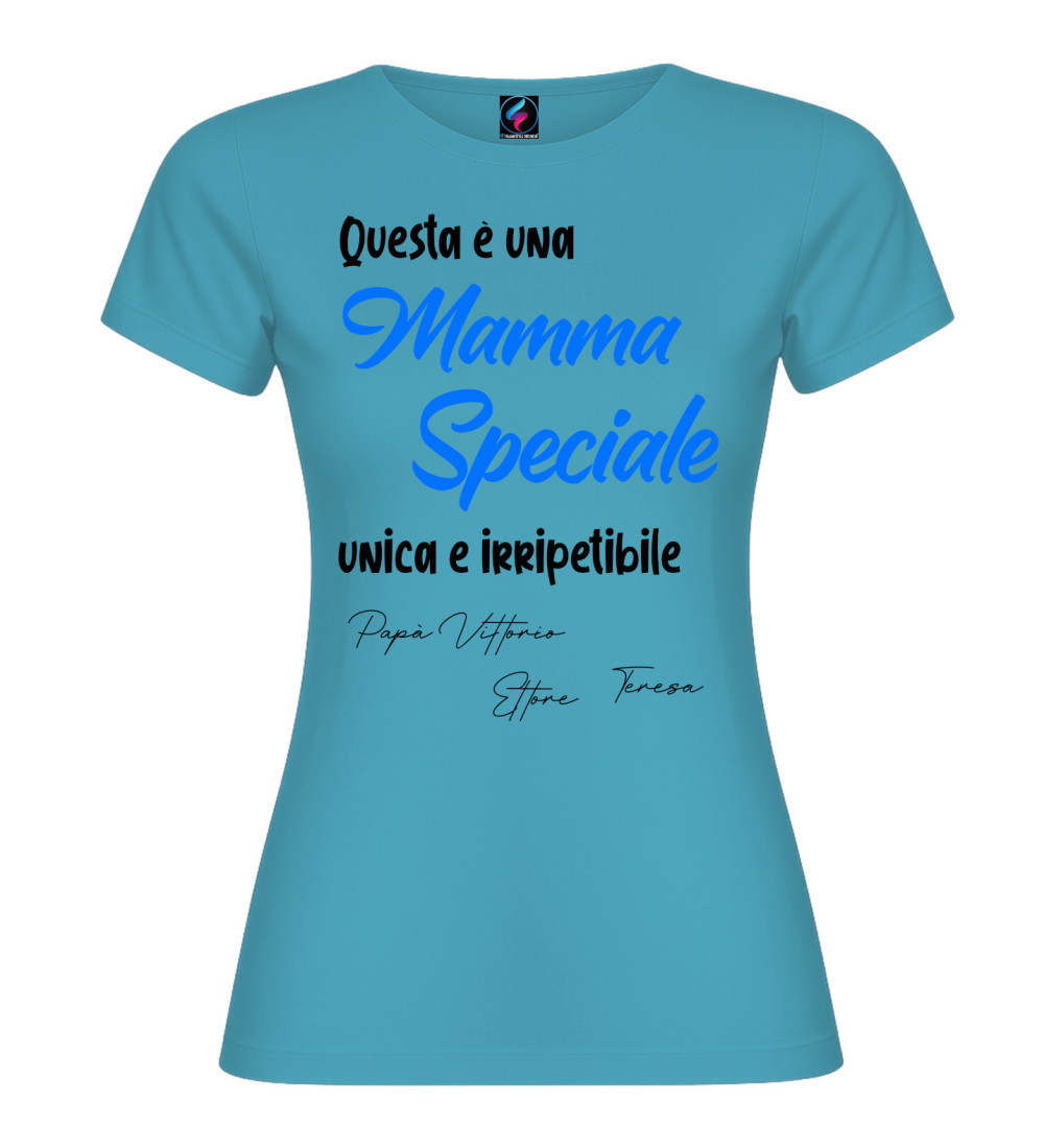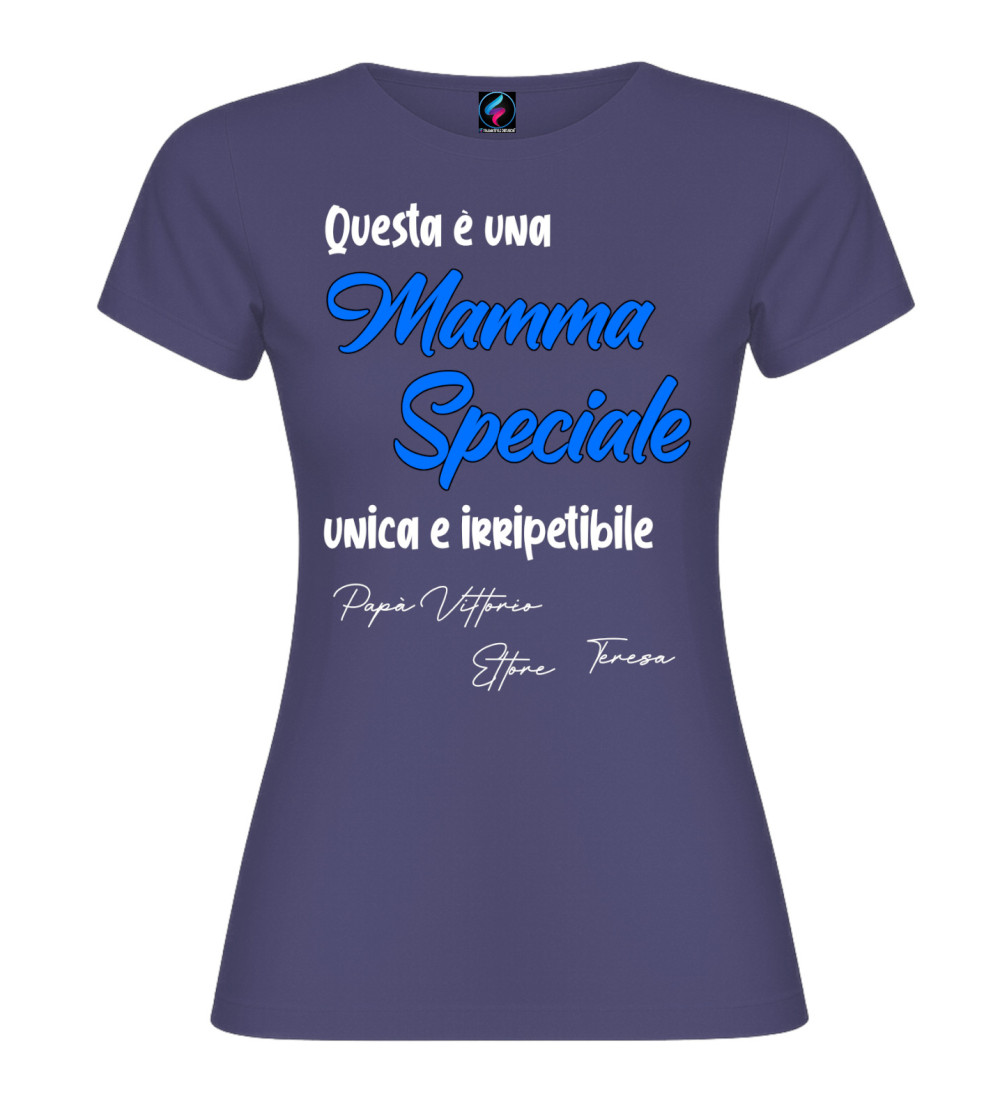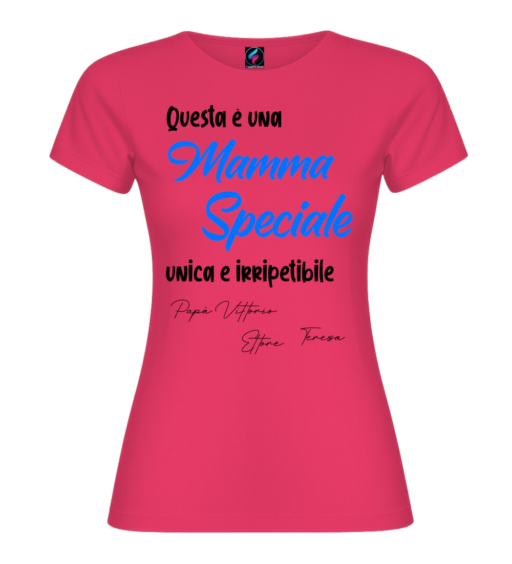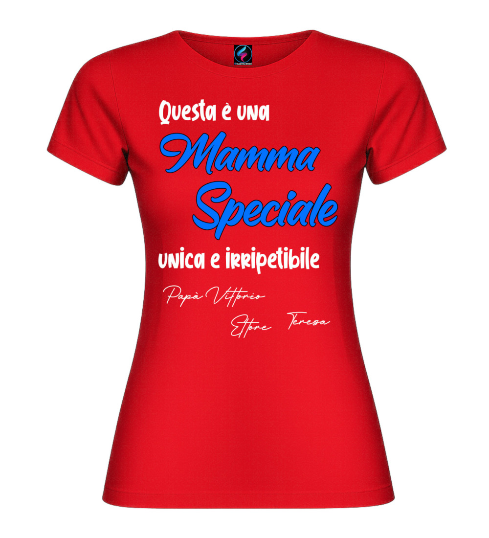 T-shirt donna con scritta “Questa è una Mamma Speciale, unica e irripetibile” e possibilità di personalizzare con i nomi (es. Papà, figli o familiari). Idea regalo perfetta per Festa della Mamma e compleanno.
