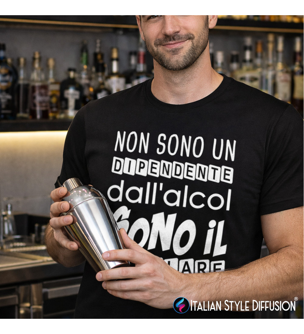 Se lavori dietro al bancone o gestisci un locale, questa t-shirt è la battuta perfetta da indossare: “Non sono un dipendente dall’alcol, sono il titolare”. Una maglietta ironica e provocatoria, ideale per strappare un sorriso tra colleghi e clienti, con un design tipografico d’impatto che si legge subito.