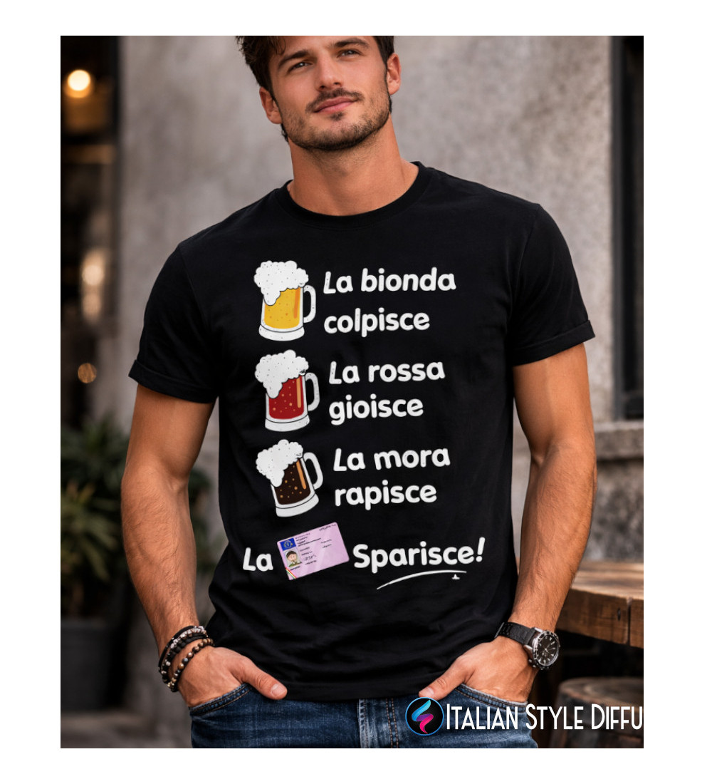 Se ami la birra e le battute da pub, questa t-shirt è fatta per te: grafica con bionda, rossa e mora e frase ironica in rima che fa sorridere al primo sguardo. Perfetta per serate tra amici, feste e momenti goliardici: una maglietta semplice, simpatica e super “da compagnia”.