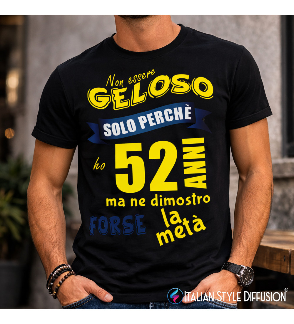 Un compleanno si festeggia con ironia! Questa t-shirt con scritta “Non essere geloso solo perché ho [ETÀ] anni… ma ne dimostro forse la metà” è perfetta per chi ama scherzare sull’età e sfoggiare un look simpatico durante la festa. Il punto forte? L’età è personalizzabile: puoi scegliere il numero che vuoi e creare una maglietta davvero su misura.