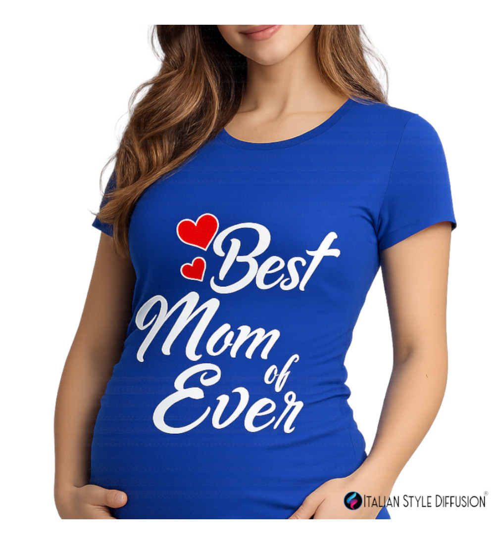 T-shirt premaman con stampa “Best Mom Ever” e cuori: dolce e minimal, perfetta come idea regalo mamma, per foto pancione e baby shower. 21 colori, taglie XS–3XL.