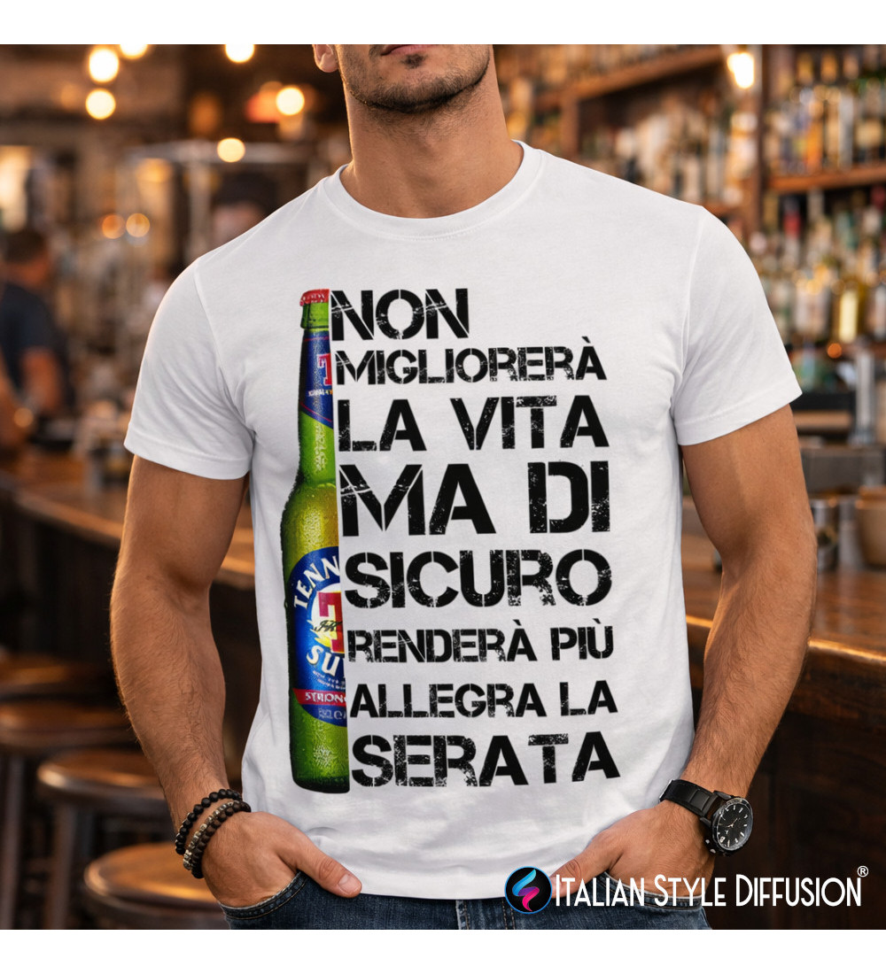 Maglietta divertente a tema birra “Non migliorerà la vita ma di sicuro renderà più allegra la serata” con grafica bottiglia: perfetta per pub e serate tra amici. Stampa personalizzata su 100% cotone, taglie e colori selezionabili.