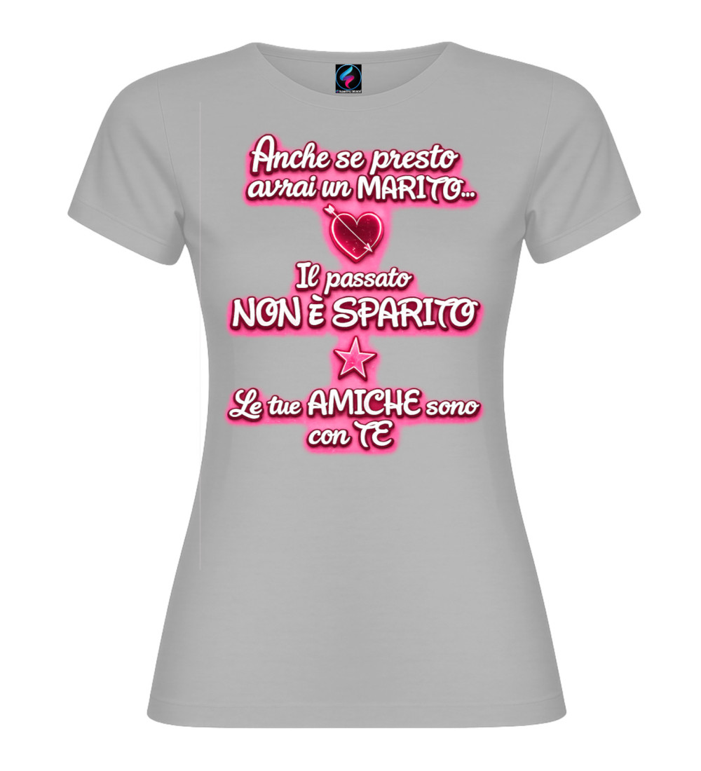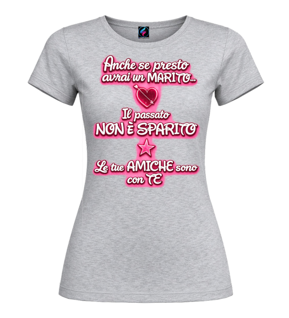 T-shirt donna divertente per addio al nubilato con frase: “Anche se presto avrai un marito… il passato non è sparito. Le tue amiche sono con te”. Perfetta per festa della sposa, serate con le amiche, foto di gruppo e bridal party. Stampa e t-shirt realizzate da Italian Style Diffusion®. Acquisti più pezzi per il gruppo? Contattaci per un’offerta con sconto quantità.