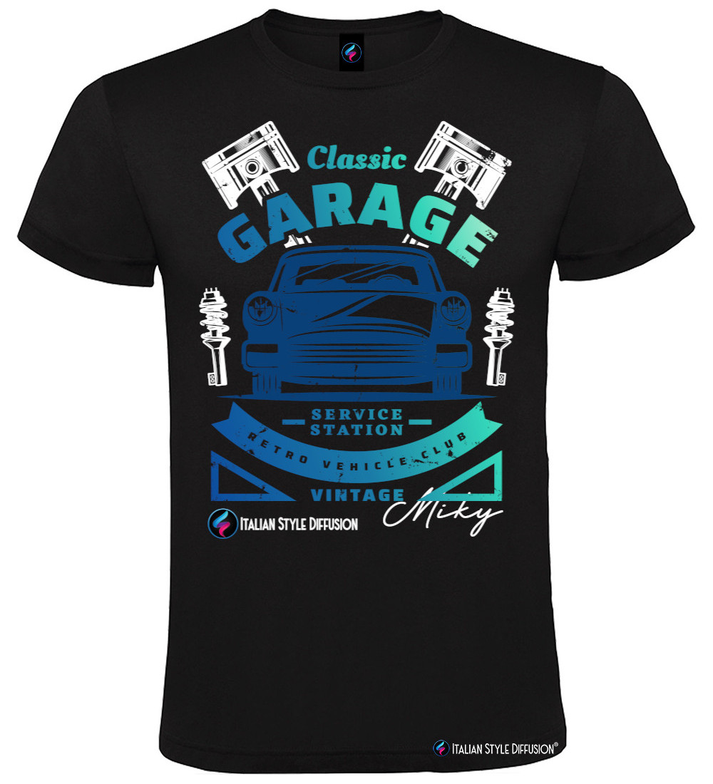 Maglietta “Classic Garage” stile vintage con auto retrò, pistoni e scritte da officina: nome personalizzabile (es. Miky). Perfetta per appassionati di auto d’epoca, motori e garage. Stampa personalizzata su 100% cotone, taglie e colori selezionabili.