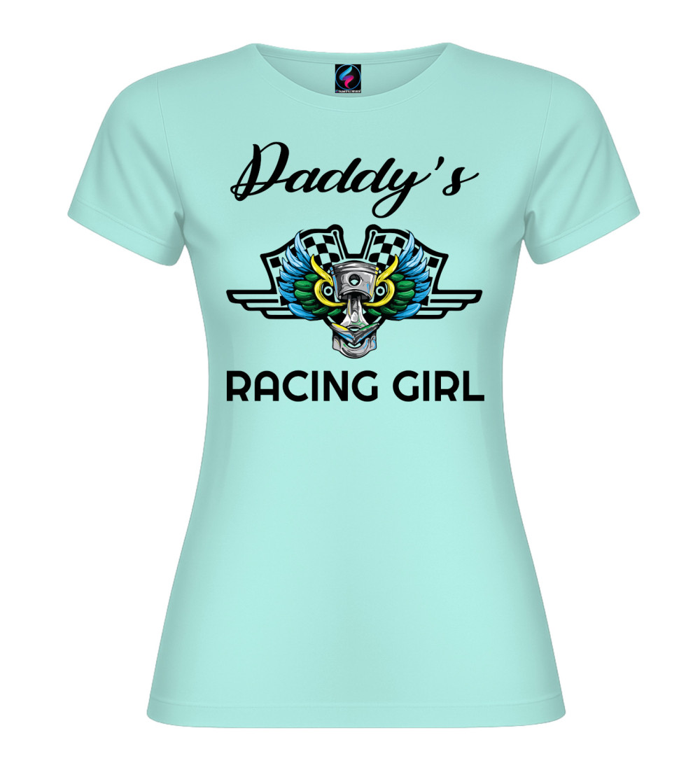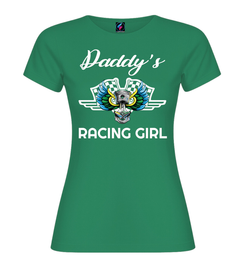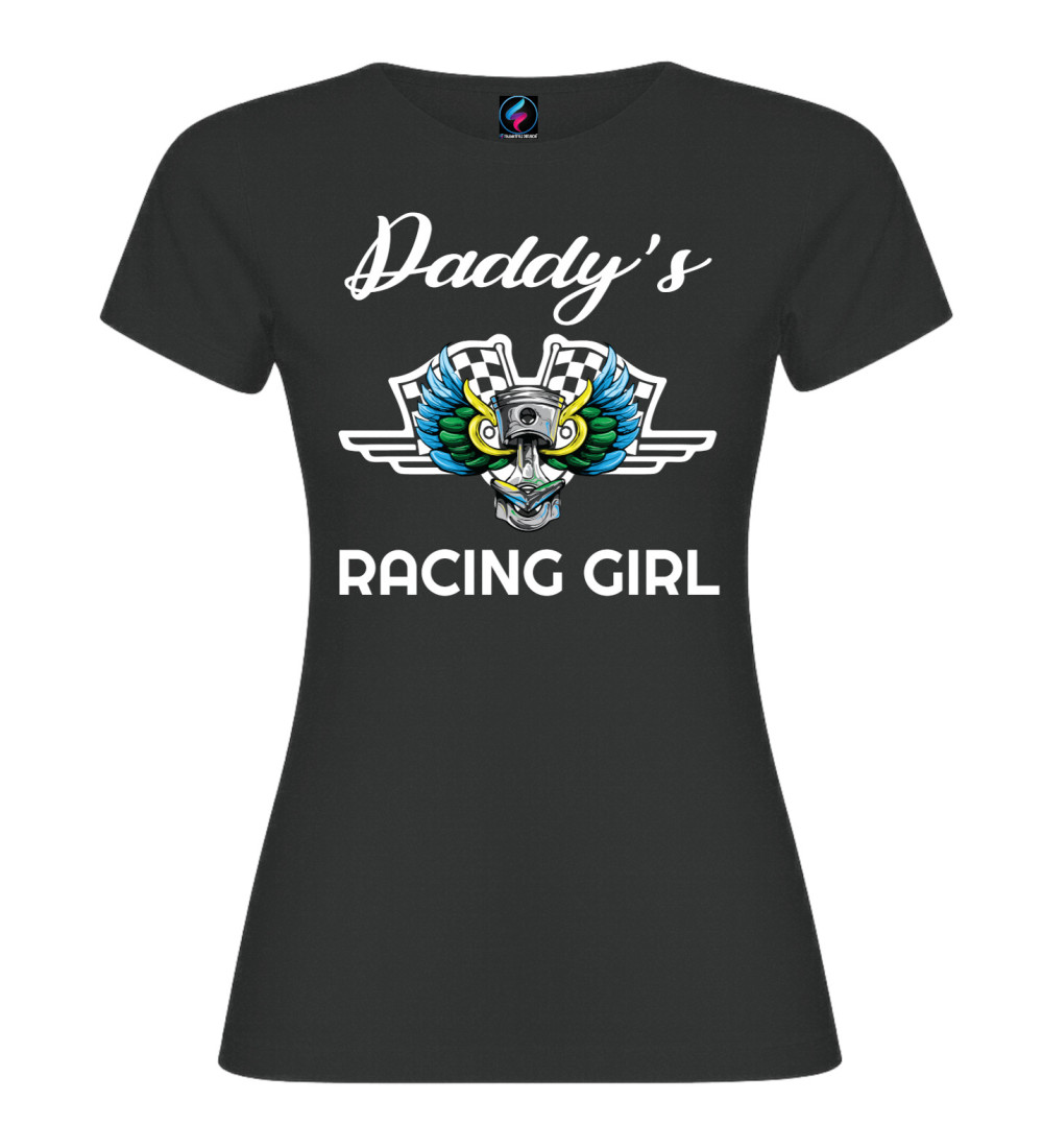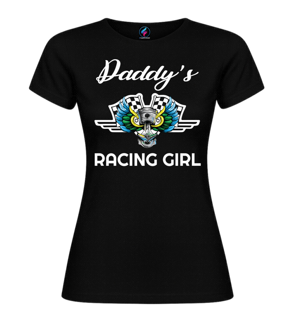 T-shirt donna in puro cotone con scritta “Daddy’s Racing Girl” e grafica racing con pistone, ali colorate e bandiere a scacchi. Perfetta per chi ama motori, pista e stile sportivo.