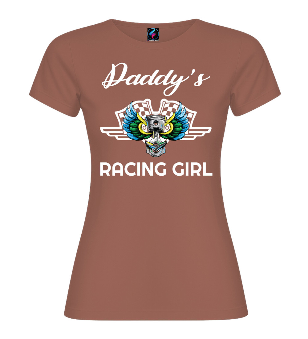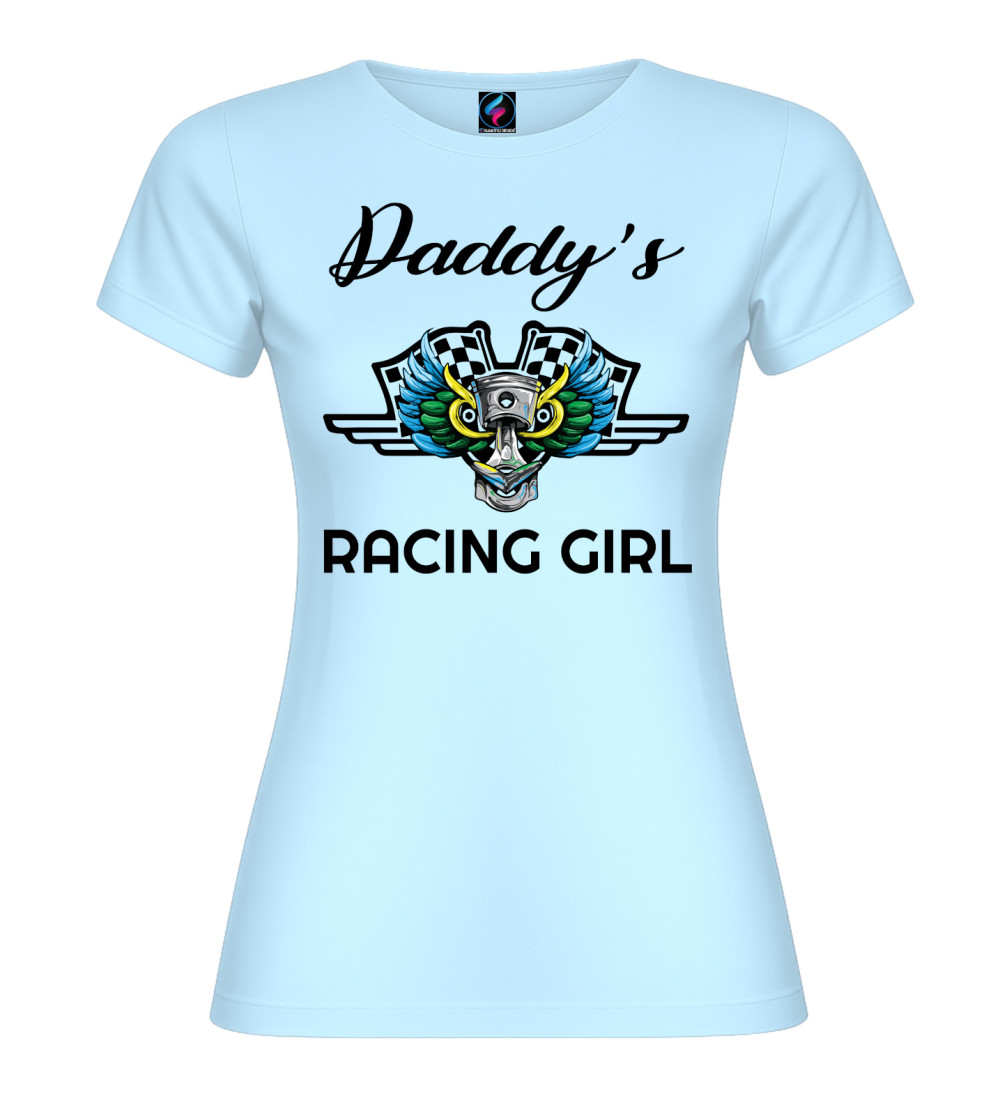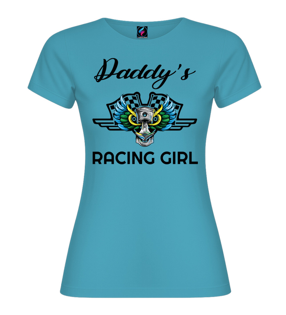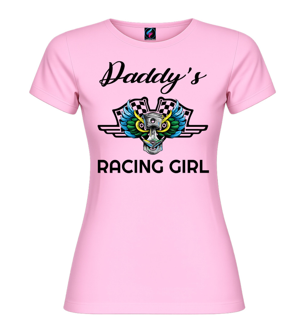 T-shirt donna in puro cotone con scritta “Daddy’s Racing Girl” e grafica racing con pistone, ali colorate e bandiere a scacchi. Perfetta per chi ama motori, pista e stile sportivo.