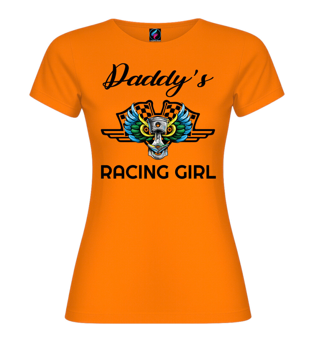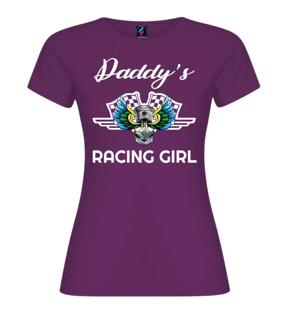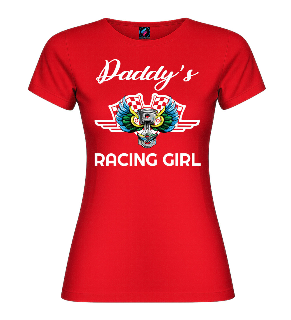 Questa T-shirt donna in puro cotone è pensata per chi vive di motori e adrenalina: scritta “Daddy’s Racing Girl” e grafica racing con pistone centrale, ali colorate e bandiere a scacchi.