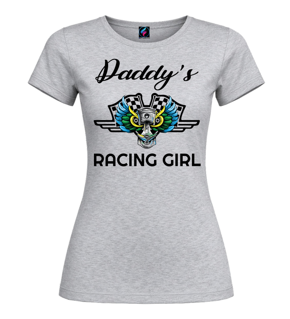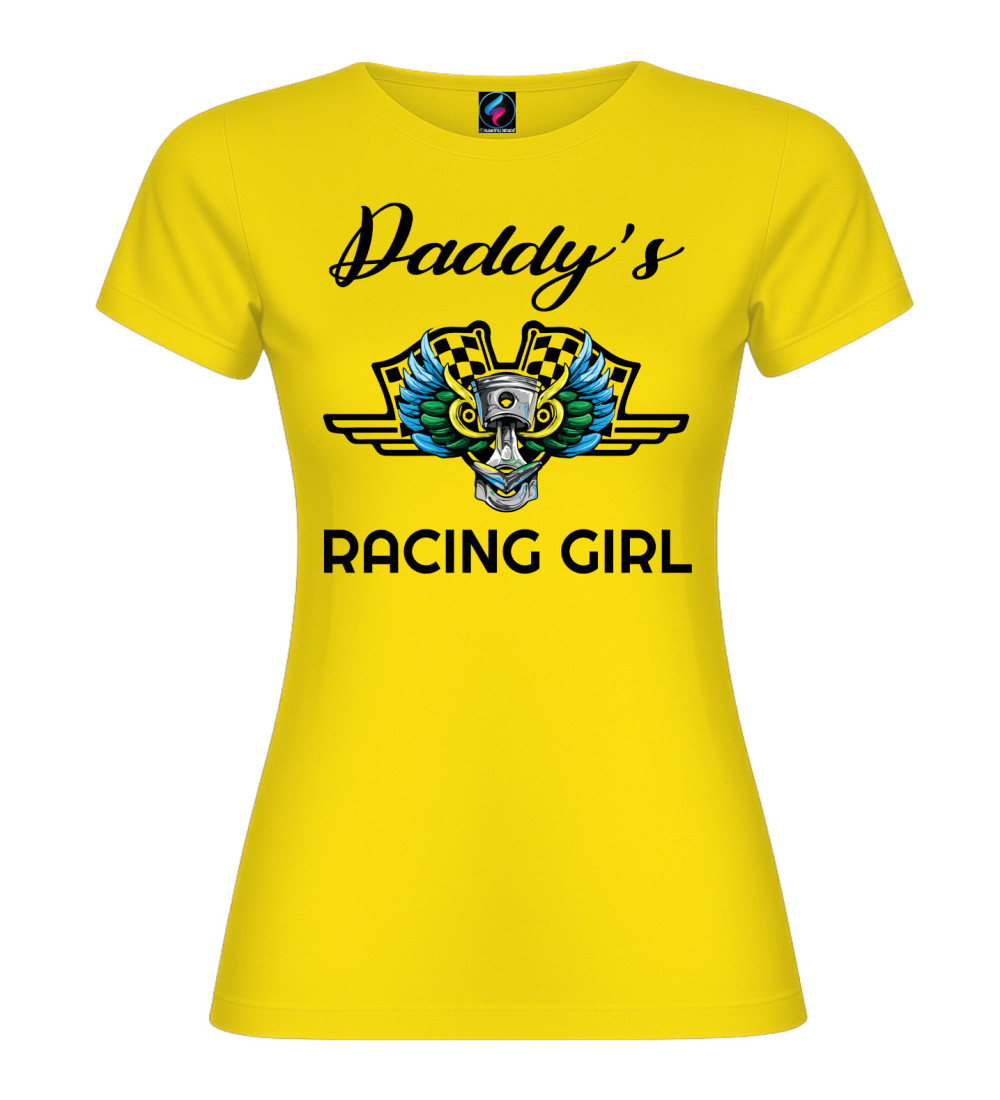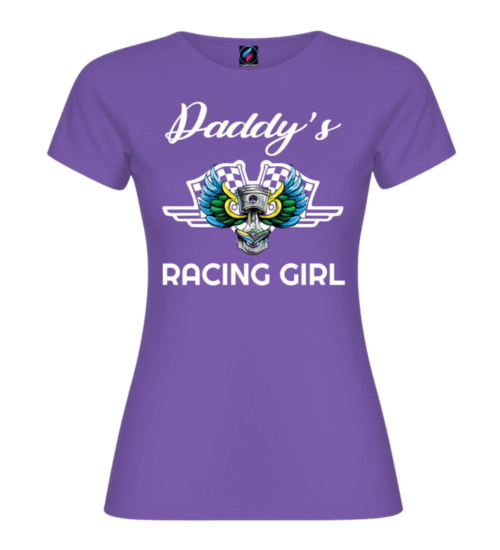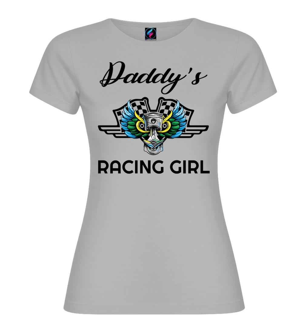 Questa T-shirt donna in puro cotone è pensata per chi vive di motori e adrenalina: scritta “Daddy’s Racing Girl” e grafica racing con pistone centrale, ali colorate e bandiere a scacchi.