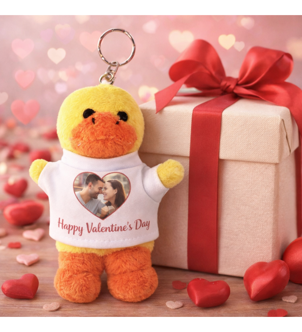 Vuoi una foto di coppia per San Valentino, una dedica per un’amica o il nome del tuo bambino? Nessun problema: puoi scegliere cosa stampare sulla maglietta della paperella e trasformare questo peluche in un piccolo ricordo da portare sempre con te.