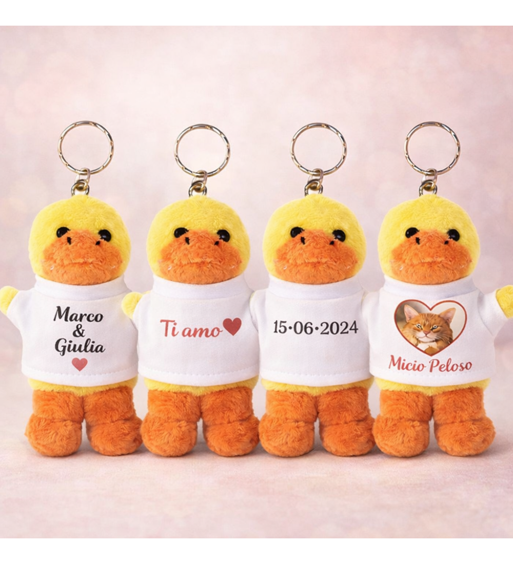 Il portachiavi personalizzato in peluche a forma di paperella è un’idea regalo dolcissima e originale: perfetto da tenere sempre con te su chiavi, zaino, borsa o astuccio. La particolarità è la sua t-shirt personalizzabile, sulla quale possiamo stampare la tua foto, immagine, scritta, nome o dedica per creare un accessorio unico, fatto su misura per te.
