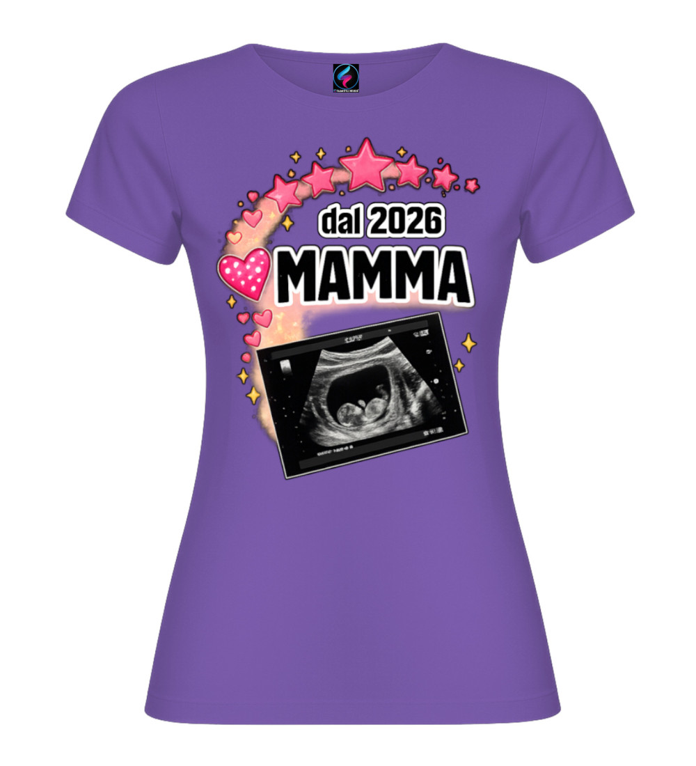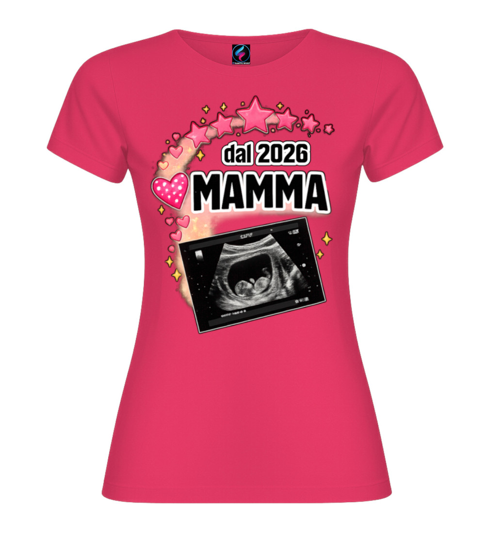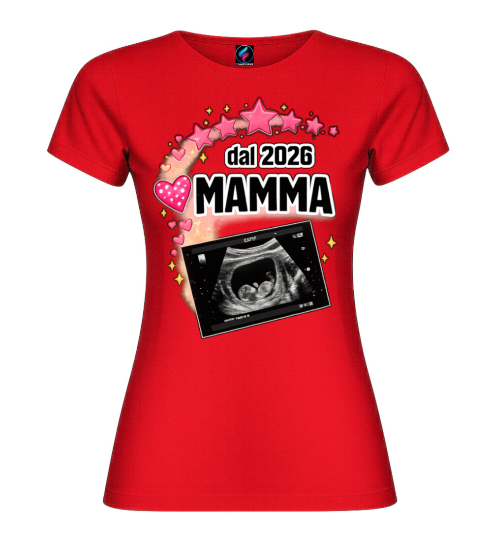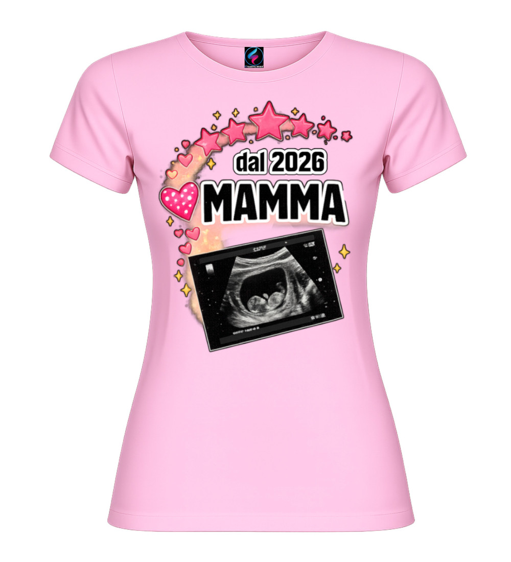 T-shirt donna in puro cotone per annuncio gravidanza con scritta “Dal [Anno] Mamma” e grafica con stelline e cuori. Anno personalizzabile (es. 2024, 2025, 2026…) e possibilità di inserire anche la tua ecografia. Disponibile in 21 colori e taglie XS–3XL.
