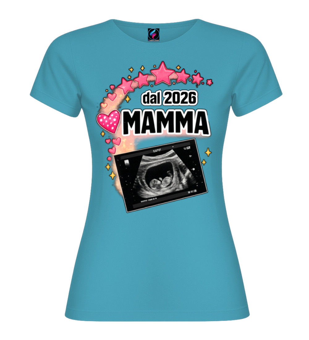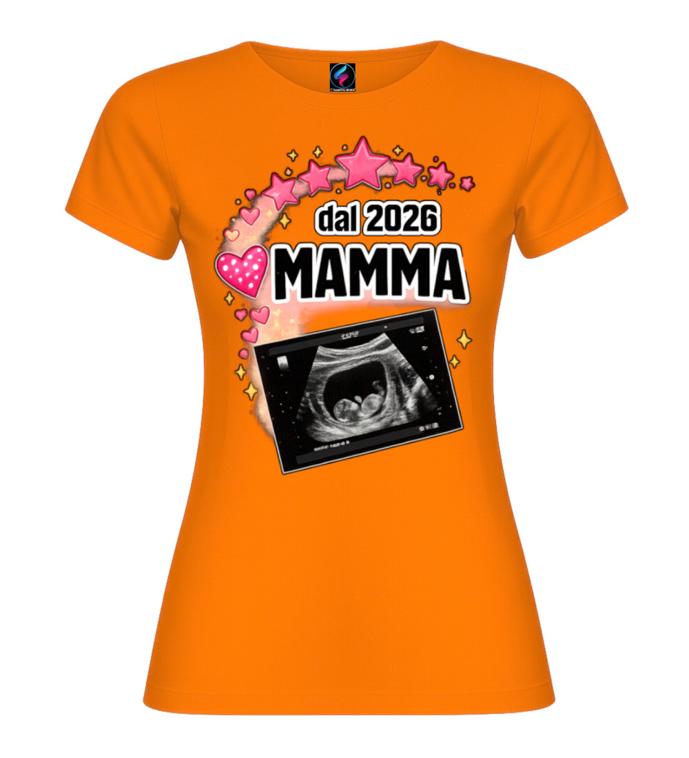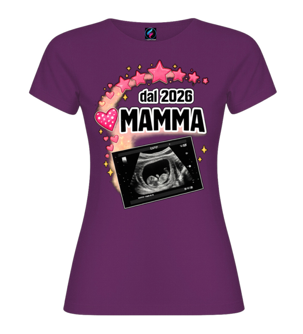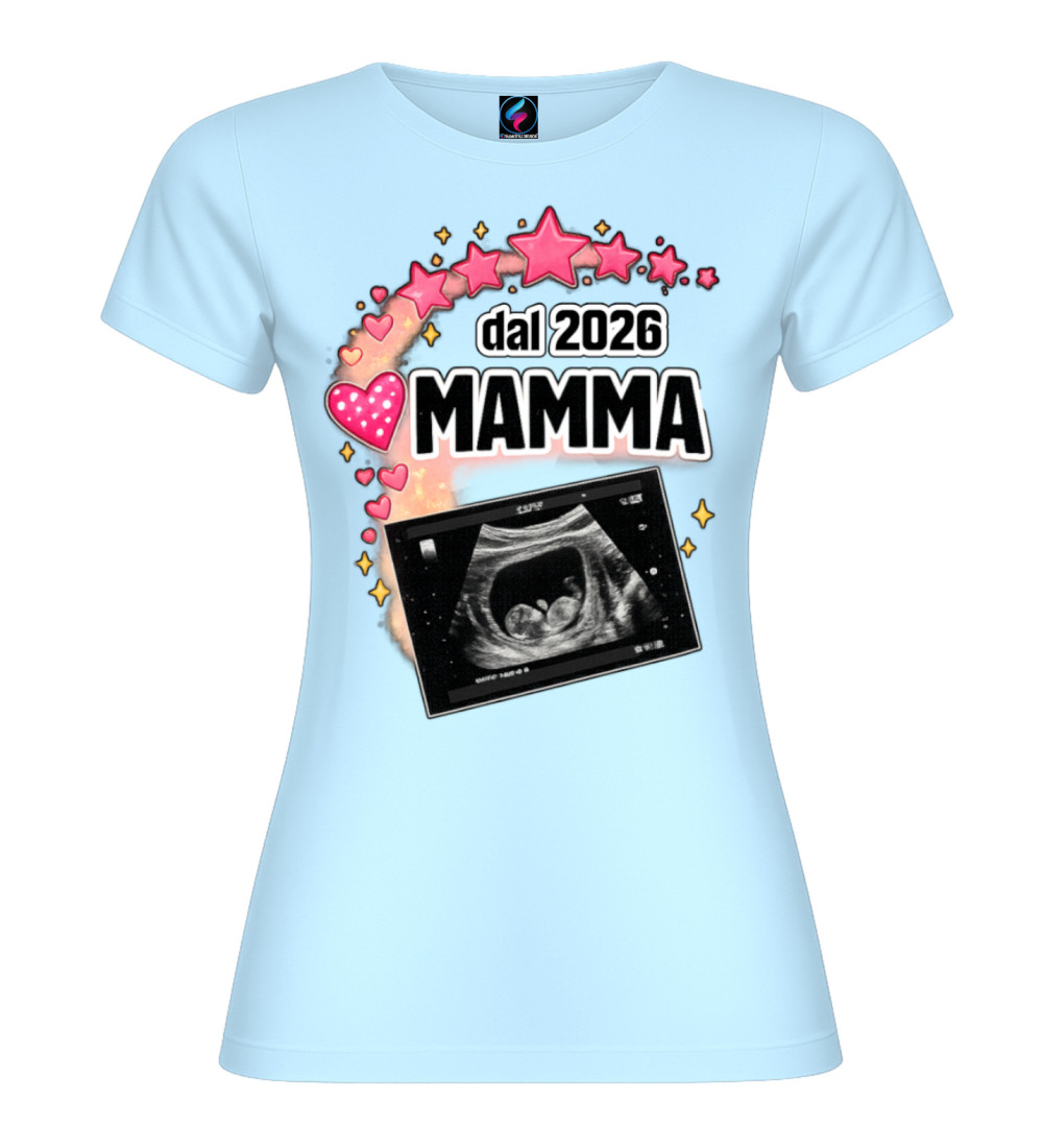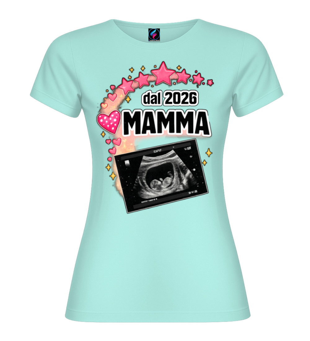 T-shirt donna in puro cotone per annuncio gravidanza con scritta “Dal [Anno] Mamma” e grafica con stelline e cuori. Anno personalizzabile (es. 2024, 2025, 2026…) e possibilità di inserire anche la tua ecografia. Disponibile in 21 colori e taglie XS–3XL.