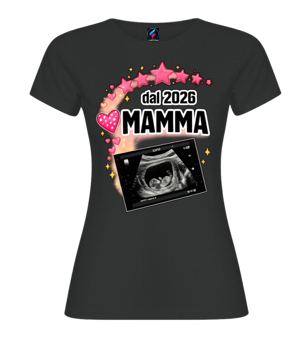 Questa T-shirt donna in puro cotone è pensata per l’annuncio gravidanza: la scritta “Dal [Anno] Mamma” è accompagnata da una grafica tenera con stelline e cuori, più l’effetto “wow” dell’ecografia in primo piano.