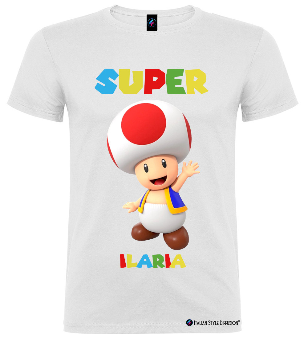 Il nome è completamente modificabile, rendendo la t-shirt perfetta come regalo originale per compleanni, feste a tema, addio al celibato o semplicemente per gli appassionati del famoso fungo.