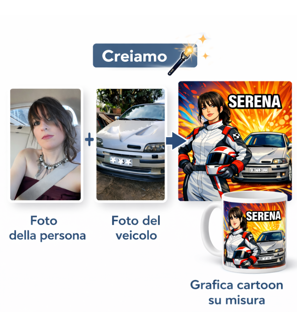 Tazza personalizzata auto e tazza personalizzata moto con foto e nome, perfetta per appassionati di motori. Carica la foto della persona, la foto del veicolo (auto, moto, camion, trattore o qualsiasi mezzo) e il nome: realizziamo la grafica cartoon e stampiamo la tua tazza personalizzata.