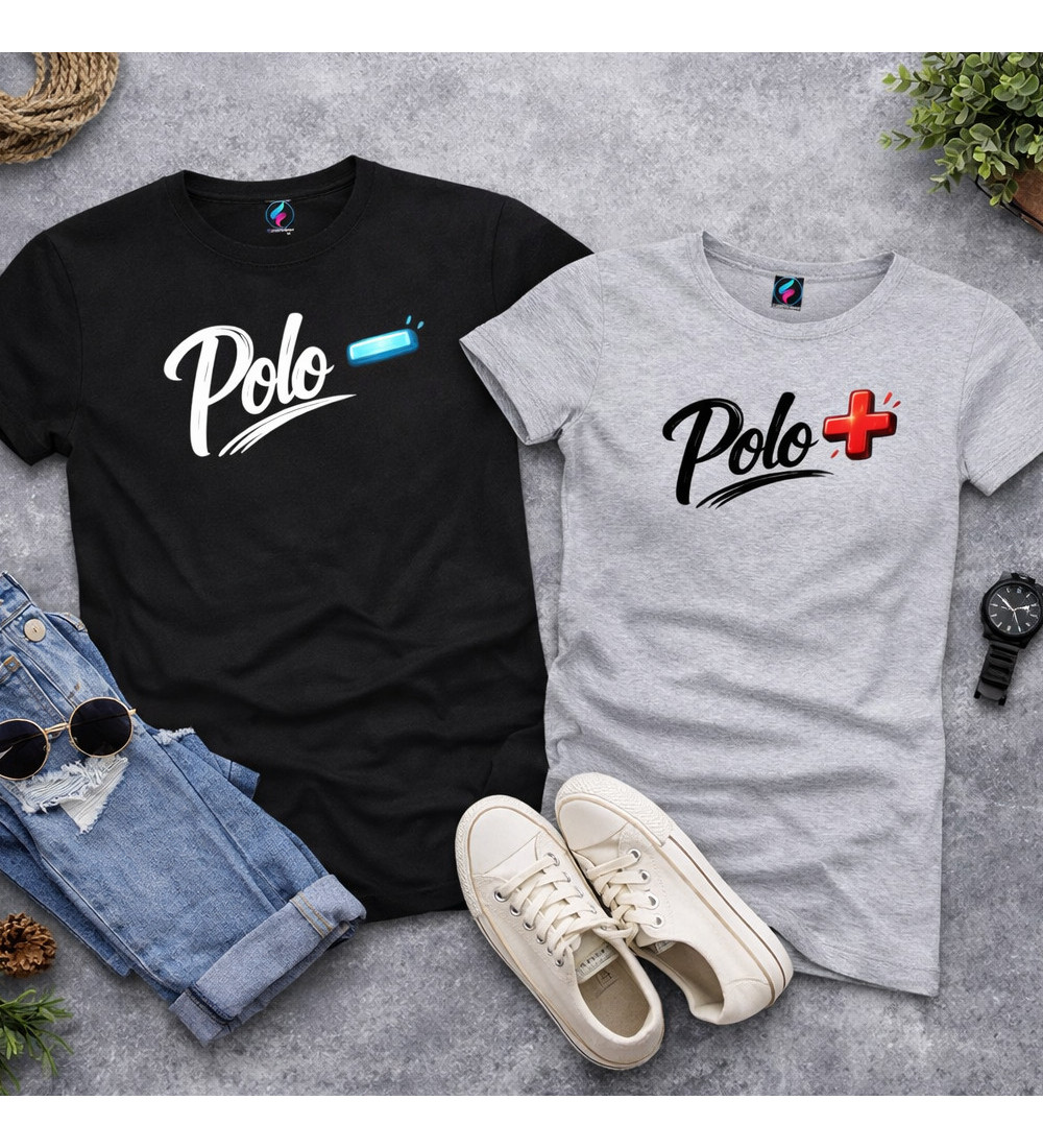 Un set di magliette coppia minimal e divertente: una con scritta “Polo -” e l’altra con “Polo +”. Un gioco “negativo/positivo” perfetto per coppie che amano l’ironia e vogliono un outfit coordinato semplice, pulito e super riconoscibile.