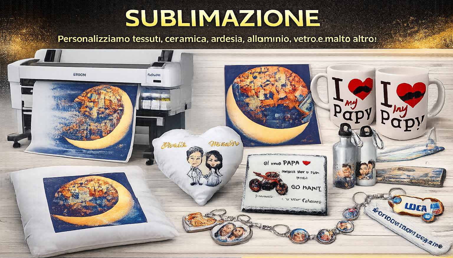 La sublimazione, nel settore della stampa digitale, è un processo in cui gli inchiostri, raggiunta una determinata temperatura, si trasformano in gas (sublimano) e si legano in modo stabile al materiale da personalizzare.