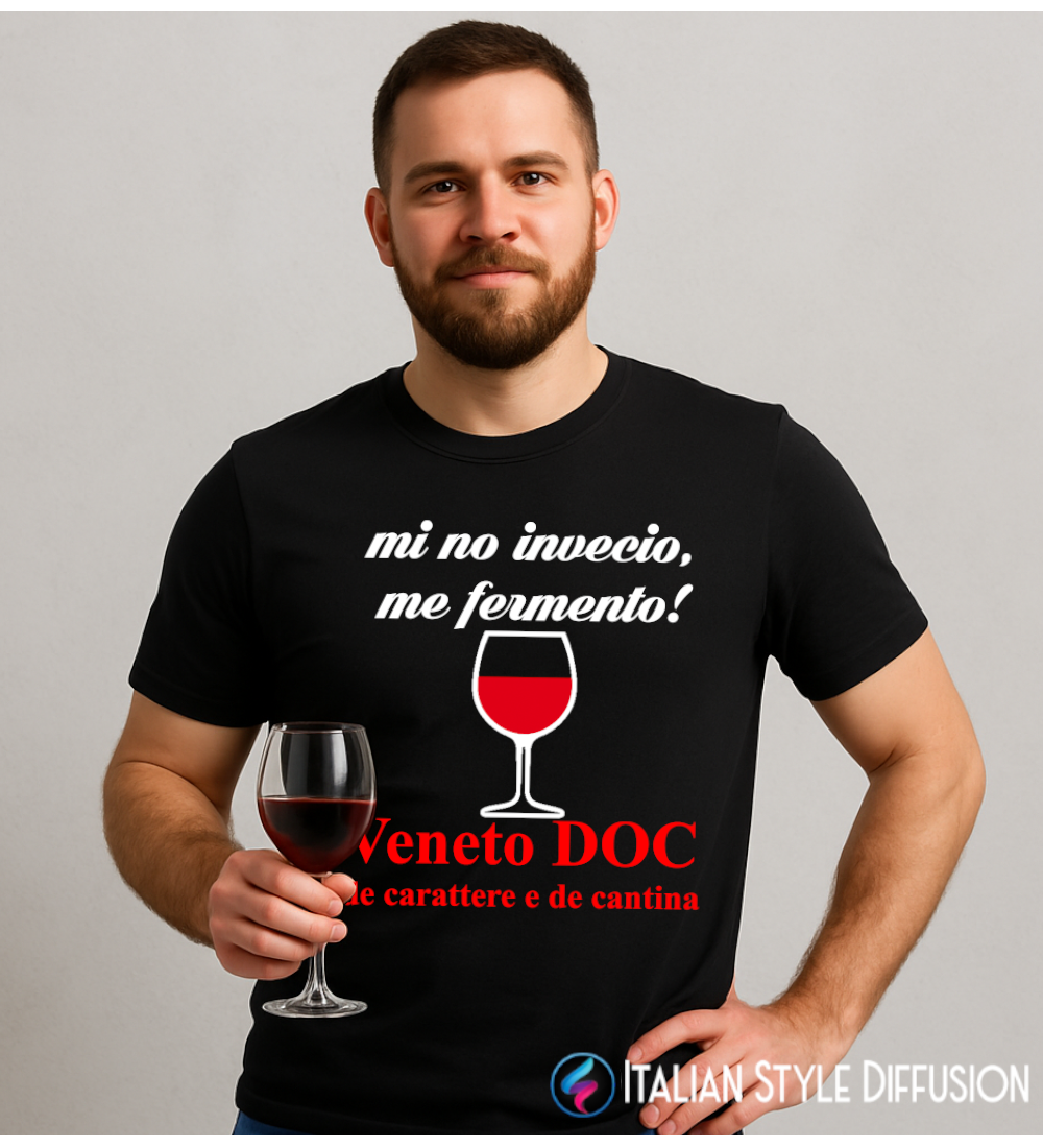 Scopri la maglietta divertente per amanti del vino con scritta in dialetto veneto “Mi no invecio, me fermento – Veneto DOC”. Un capo originale e ironico che celebra la cultura enologica veneta e quel senso di appartenenza alla nostra terra.